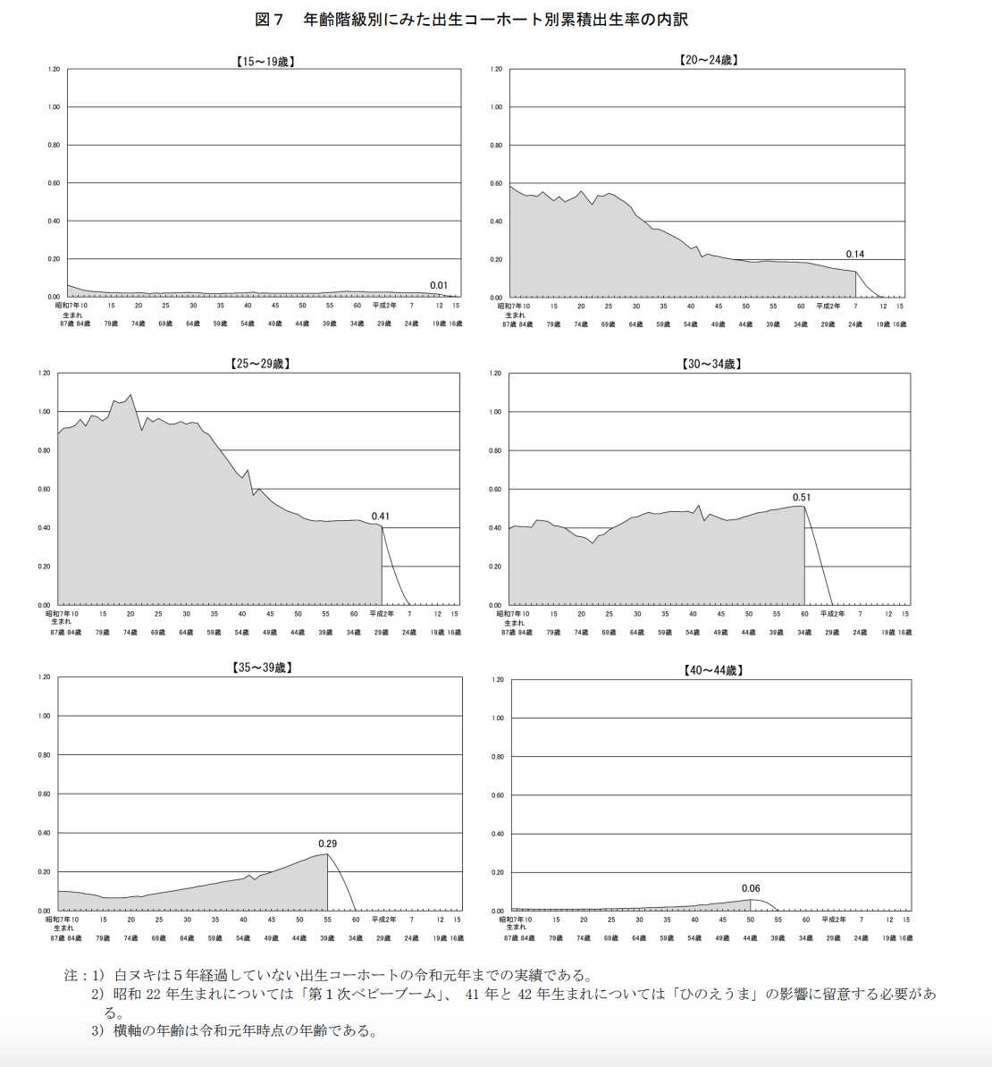 これにより、ある世代の女性が「どの年齢でどれくらいの子どもを産んだのか」ということが明らかになります。たとえば、あるコーホートの女性たちが20-24歳の間に0.5人の子どもを産んだ、25-29歳の間に1.2人の子どもを産んだ、というような情報が得られます。